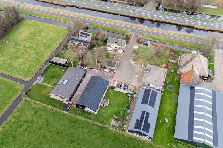 Aan de overzijde van de woning bevindt zich een afgeplatte stolpboerderij met houten vierkant en een aanbouw/uitbouw over de gehele breedte. Het totaal meet circa 423 m² BVO.