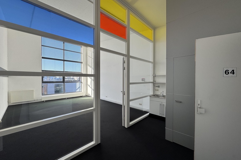 Deze kantoorruimte is ideaal voor professionals die op zoek zijn naar een inspirerende, goed verlichte en praktische werkplek in Noordwijk. Het kunstwerk van Piet Mondriaan in het raamkozijn voegt een uniek en creatief element toe aan de ruimte, waardoor het zich onderscheidt van traditionele kantoorruimtes.
